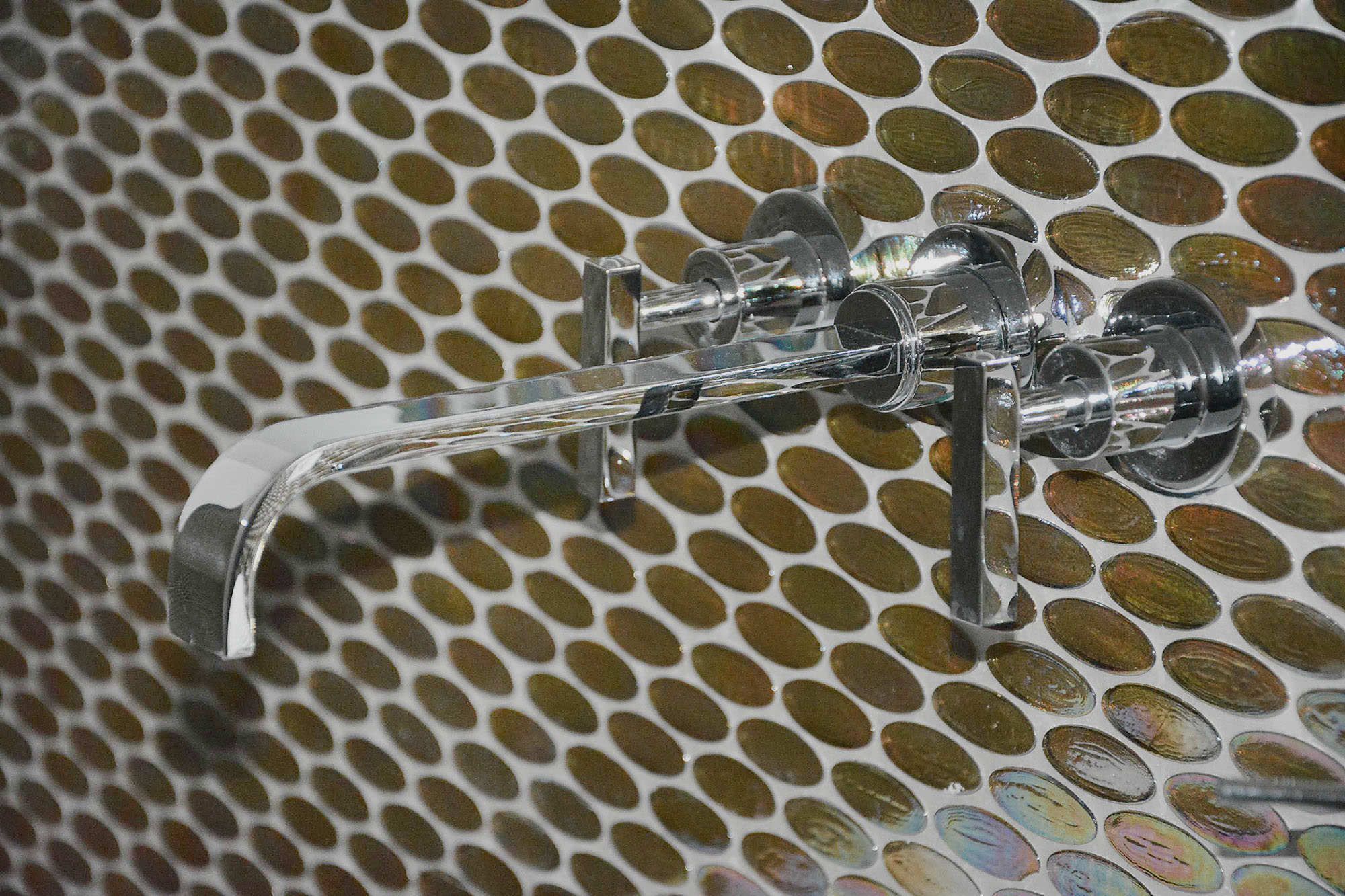 Unusual oval shapes characterize the ambiance with iridescences and shades. This mosaic tile remembers the ’70 when organic shapes were preferred over standard ones. A touch of modernism for every creative design.
